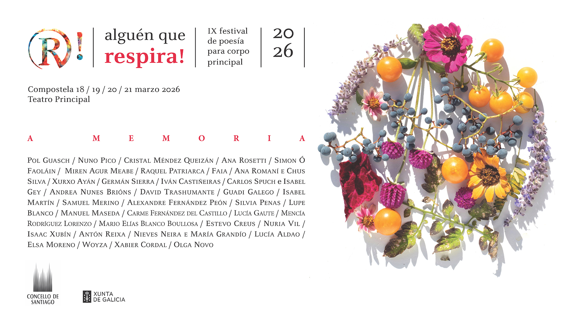 Do mércores 18 ao sábado 21 de marzo, o Teatro Principal acollerá a novena edición do ‘Alguén que Respira!’ Festival de Poesía para Corpo Principal, unha cita que reunirá en Compostela poetas, artistas, pensadoras e pensadores arredor dun programa que combina recitais, conversas, cinema, ciencia e propostas performáticas. A poeta Olga Novo será a encargada de ler este ano o Manifesto Galego polo Día Mundial da Poesía nunha edición que sitúa a memoria como eixo central da súa programación.