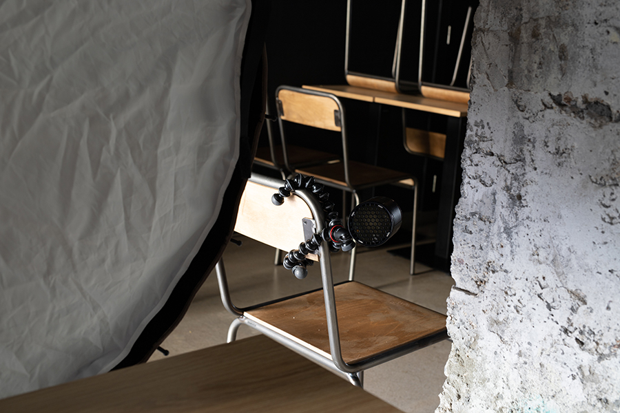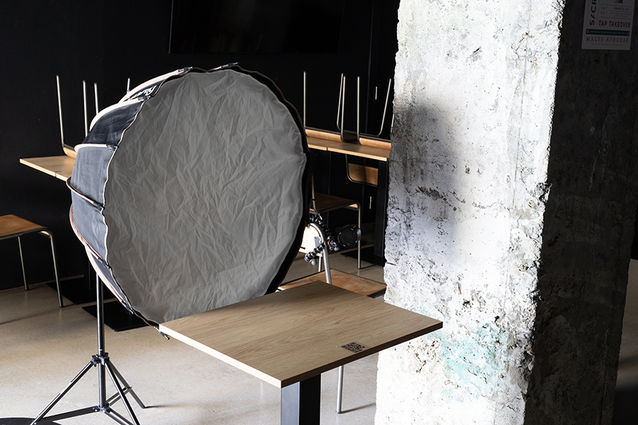 O primeiro que debes seleccionar é un espazo n dentro do local que te permita obter unha boa composición para a fotografía. Neste caso, eu busquei un fondo que contrastara cos pratos que ía fotografar, así que puxen unha mesa do local diante dunha das columnas que se distribúen pola superficie de Malte. Se non vas empregar luz artificial, podes buscar un lugar onde la luz do sol ou a luz ambiente se adapten ao tipo de imaxe que desexas capturar.