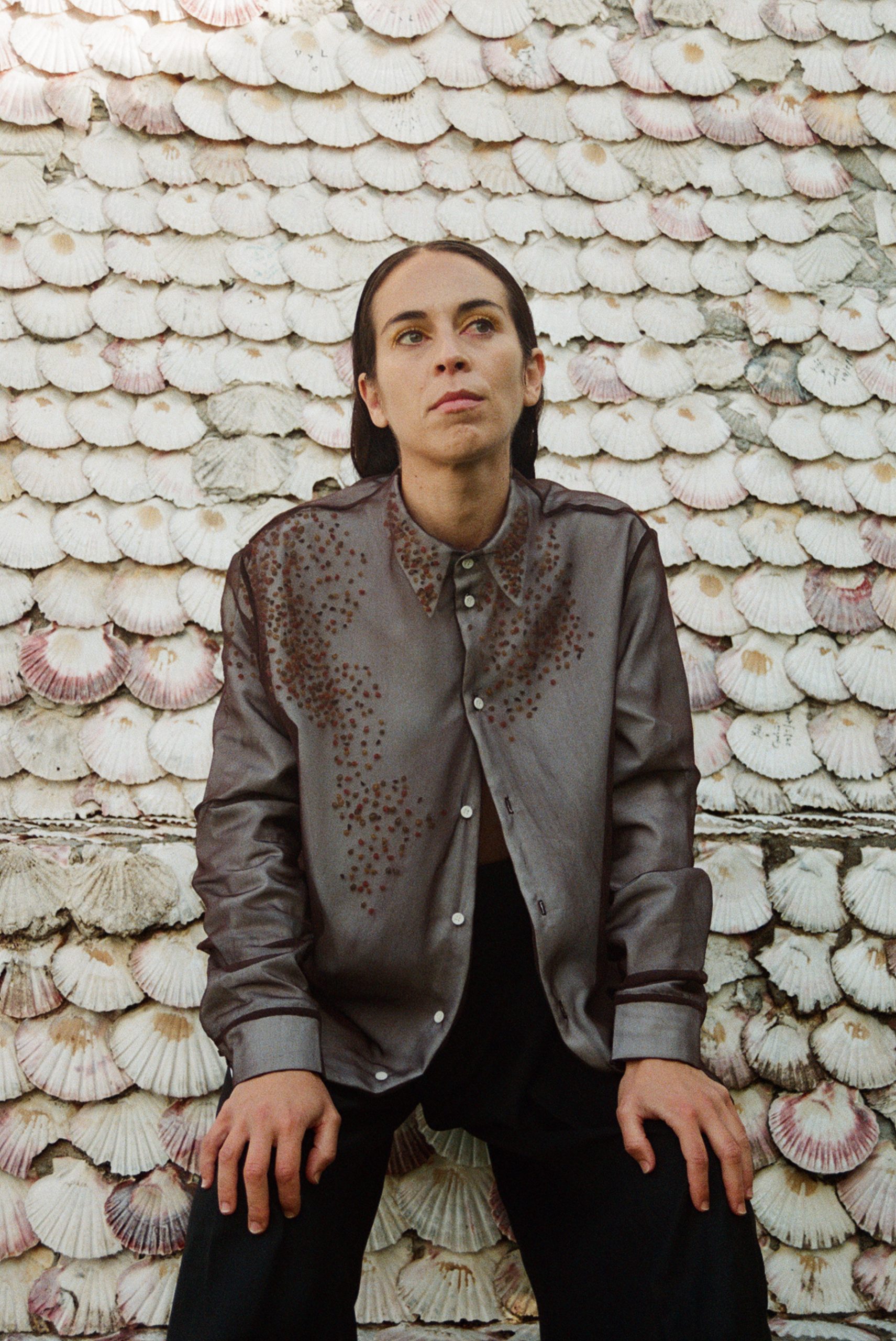 A marca de roupa artesanal Carmen 17 (Madrid) colabora coa artesá Montse Betanzos (O Grove) para a súa colección cápsula deste inverno, “Colareira”, coa que buscan reivindicar o patrimonio cultural e creativo do oficio artesanal das colareiras da Toxa a través da moda. As cunchas empregadas na elaboración de colares e complementos incorpóranse ao deseño e á confección das prendas a modo de pedrería natural. Esta dobre camisa con base de popelín está bordada á man por Montse Betanzos coas cunchas recolectadas por ela na Toxa. Leva unha capa de gasa de seda encapsulando as buguinas creando un velo que permite ver as cunchas como se ven na praia os días de brétema.