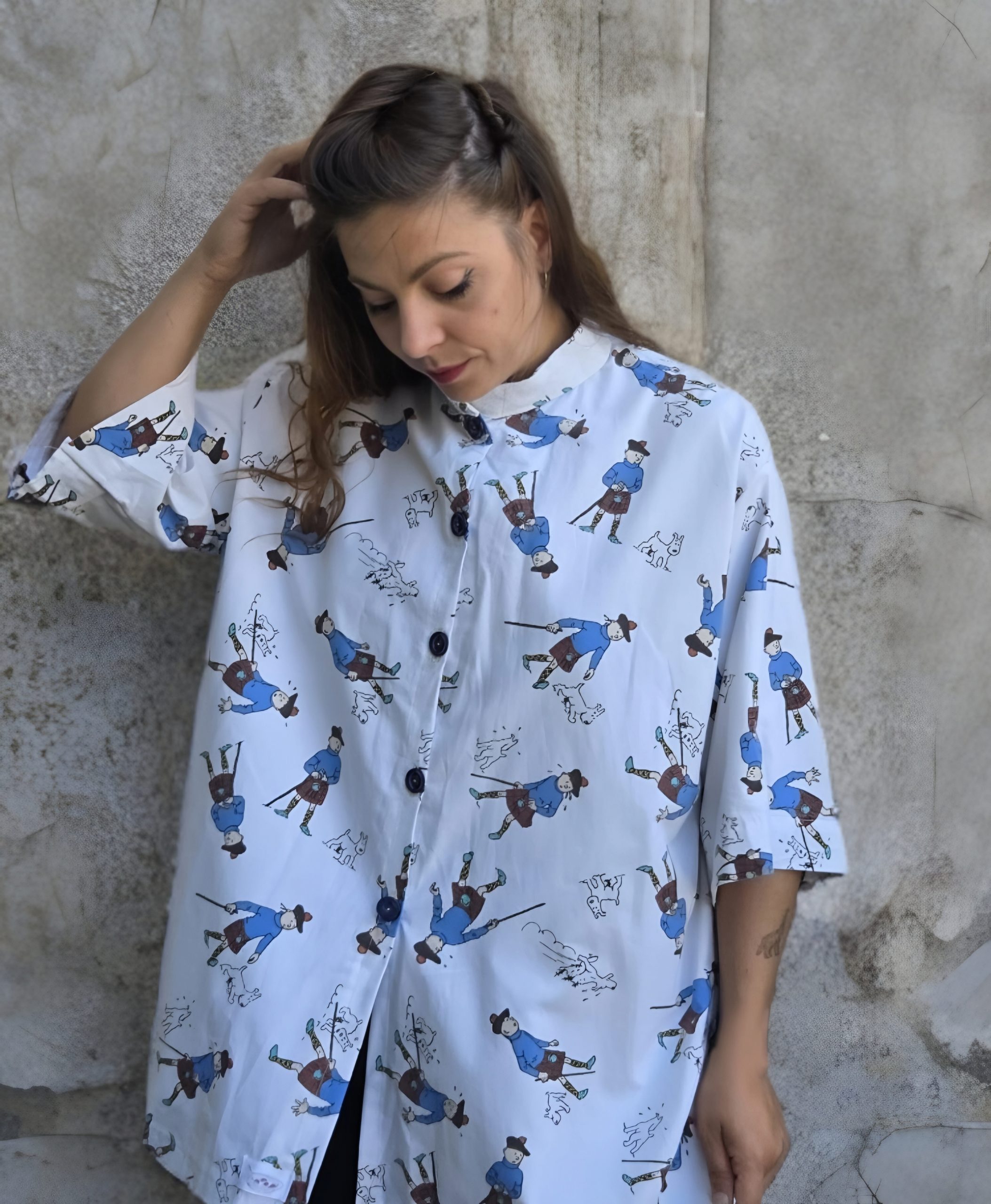 Sopa de Nuez (Lugo) elabora roupa unisex, divertida e con patróns contemporáneos a partir de tecidos e de fornituras que a artesá Verónica Martí busca e merca en feiras e antigas tendas de tea. Esta camisa é unha serie limitada de dúas unidades por talla (S, M, L) elaborada cun tecido estampado de Tintín procedente de Francia e botóns vintage procedentes de Berlín.