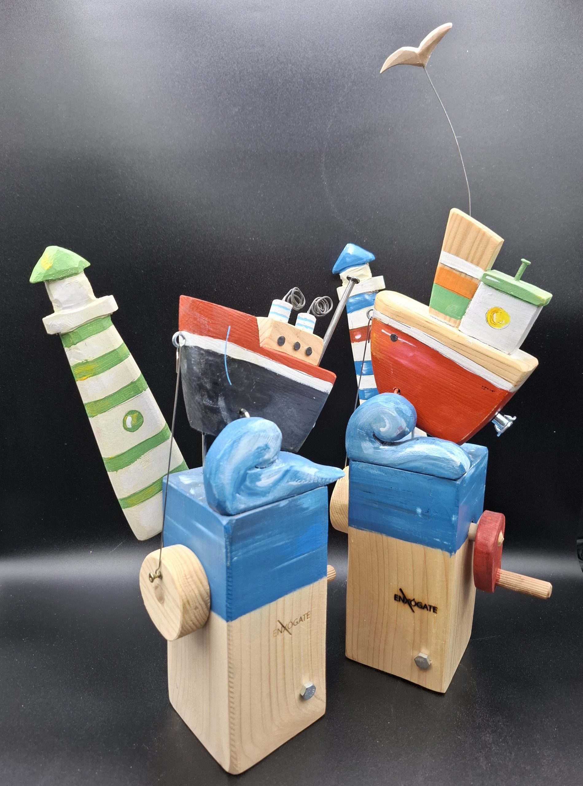 A proposta do obradoiro Enxógate (Quiroga) son estes barcos autómatas, que reproducen o movemento dos barcos no mar a través dun sinxelo mecanismo. Son pezas creadas á man en madeira e con pinturas e vernices libres de tóxicos.