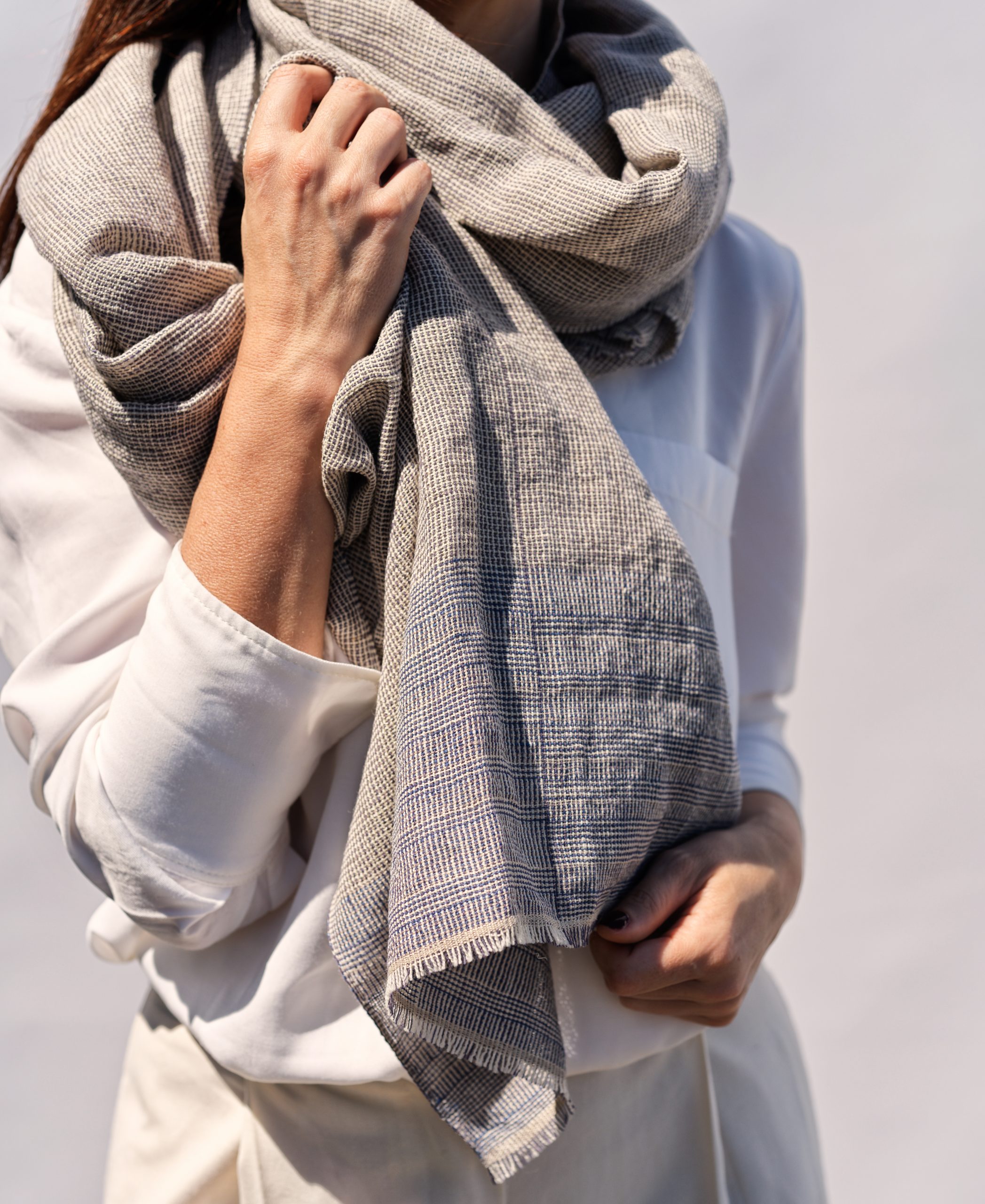 O tecido tradicional galego é unha das influencias clave do obradoiro de tecido artesanal Pal.lium (Cangas) que chega mesmo ata aquelas de deseño máis contemporáneo como é o caso deste chal de deseño asimétrico inspirado tamén nos téxtiles da Bauhaus. Está elaborado en lá meriña e liño. Medidas 70x200cm.