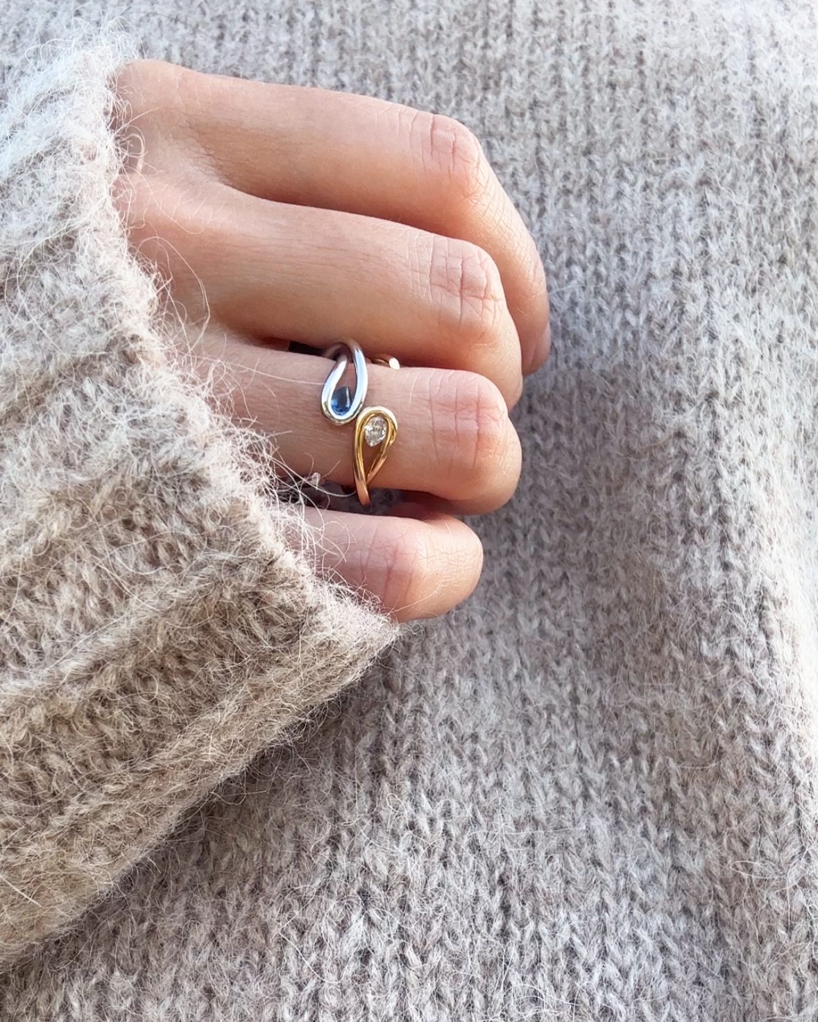 Os aneis amoreables da colección Juana, da xoieira Sara Tejerina (Vilanova de Arousa), están pensados para que cada persoa cree a súa propia composición xa que están deseñados para que as xemas funcionen dende diferentes puntos de vista. A colección está elaborada con ouro de 18k e inspírase nas pinceladas de cor que caracterizan a obra da artista Juana Tejerina, a través de xemas naturais coma o zafiro ou o diamante.