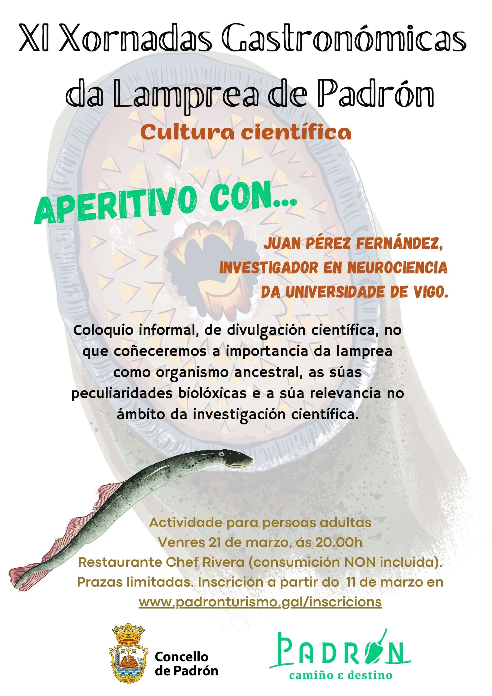 Ademais da oferta gastronómica, o programa incluirá diversas actividades dirixidas a diferentes públicos. Así, o venres 21 de marzo, ás 20:00 horas, o Restaurante Chef Rivera acollerá a charla Cultura científica con Juan Pérez Fernández, investigador de neurociencia da Universidade de Vigo. A sesión incluirá un coloquio informal de divulgación científica no que se abordará a importancia da lamprea como organismo ancestral, as súa peculiaridades biolóxicas e a súa relevancia no ámbito da investigación científica. A consumición non estará incluída. A actividade está orientada a un público adulto.