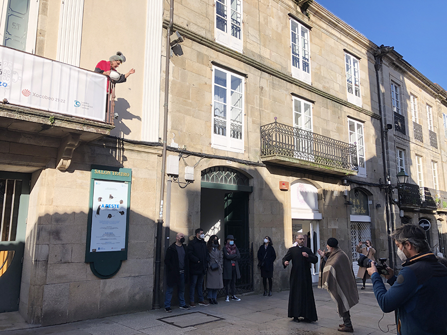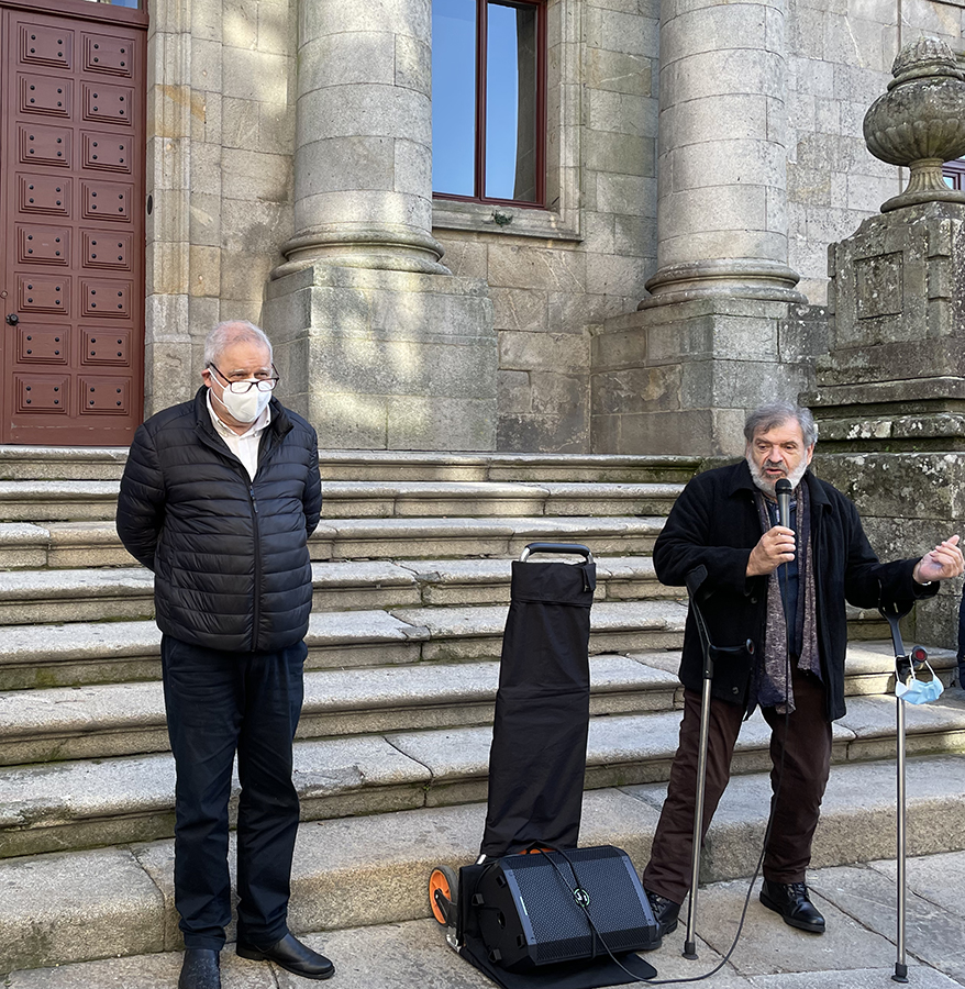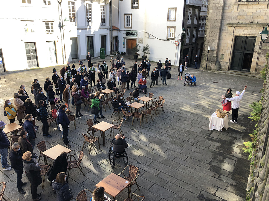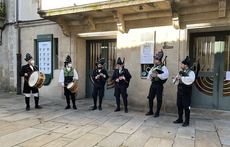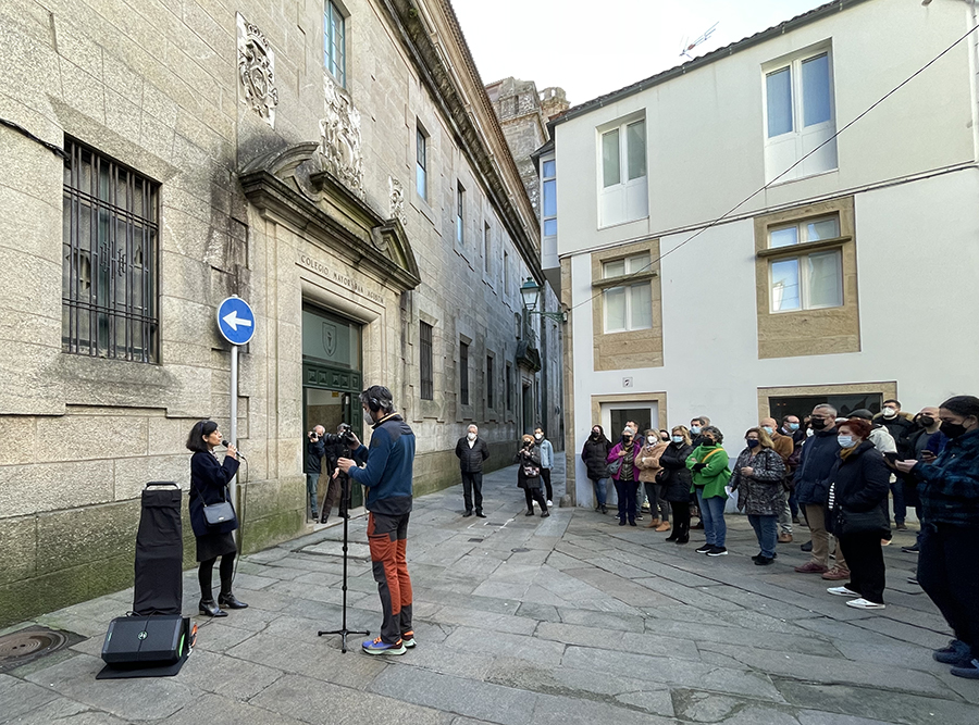 A Asociación de Medios en Galego celebrou o Día dos Medios en Galego co roteiro ‘Compostela e a lingua’, que se desenvolveu en Santiago este sábado pola mañá. Baixo o lema ‘Bota a lingua a pacer’, realizáronse paradas en lugares simbólicos na loita polo mantemento do idioma. O percorrido estivo acompañado polo grupo de gaitas da Asociación Cultural Panaraiada.