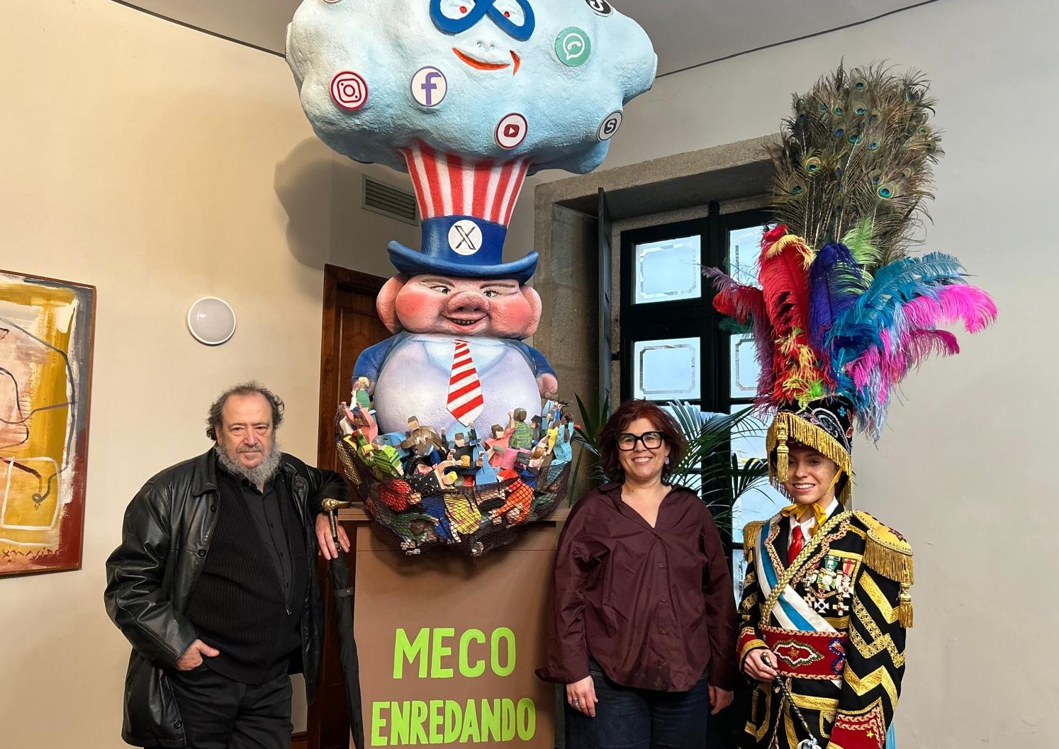 Nesta ocasión o Meco está inspirado na presenza das redes sociais na sociedade, facendo alusión a Trump e a Elon Musk, detallou o seu creador, José Manuel Méndez que explicou que se trata do boneco número 33 que realiza para o Entroido compostelán, aínda que se cumpren 40 anos desde que o Concello decidiu apoiar a idea de incluílo nas Festas.